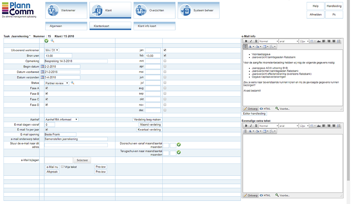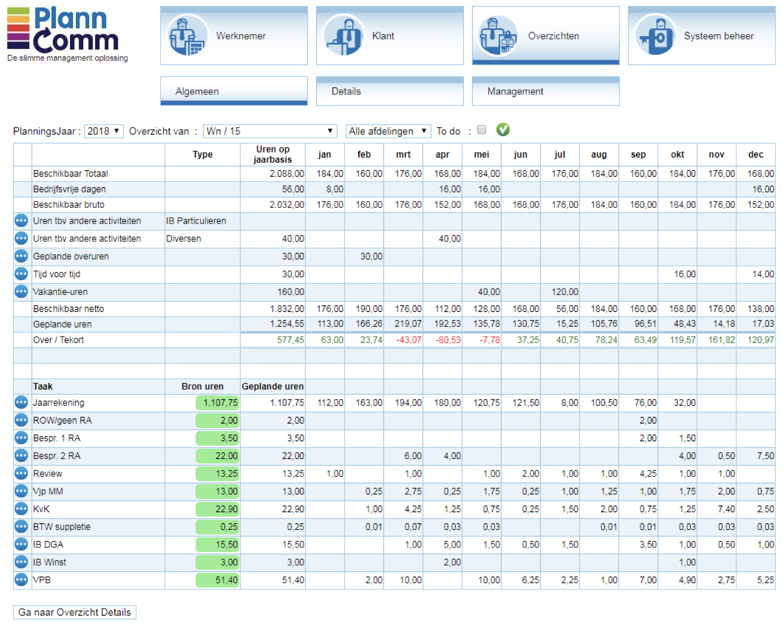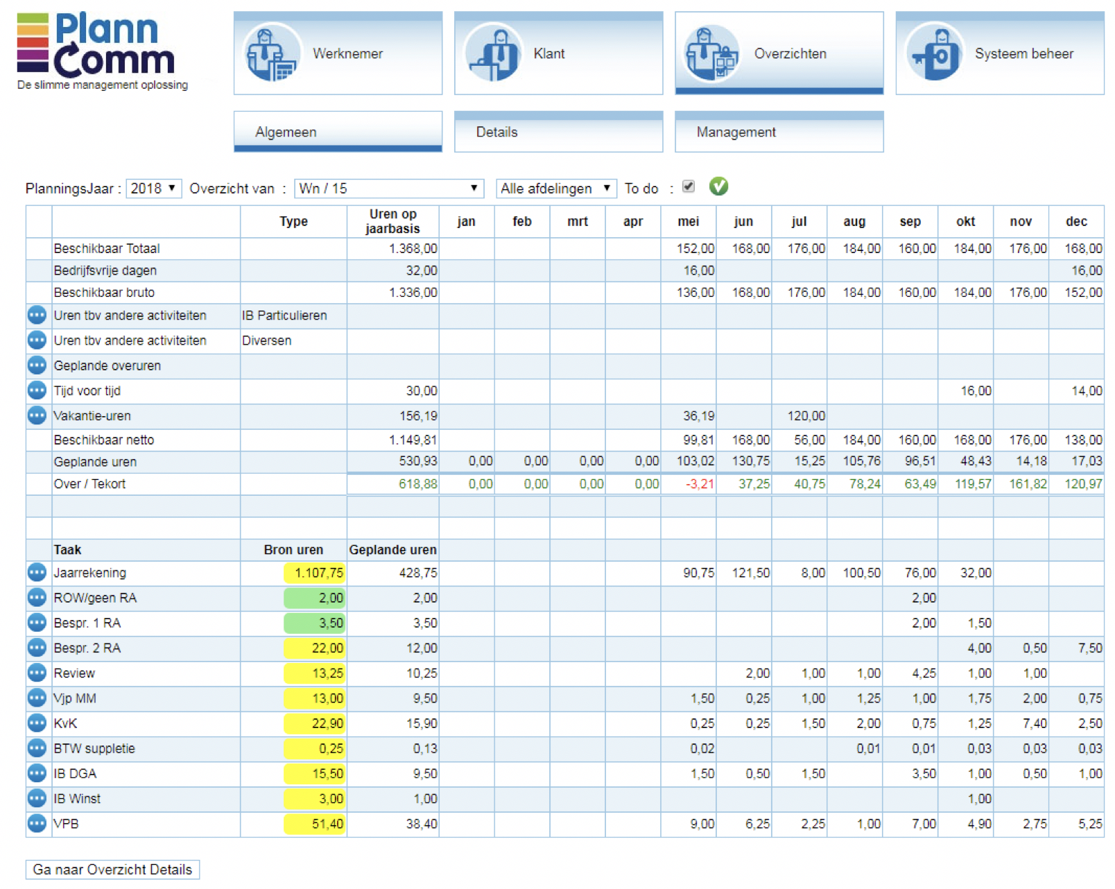 Bekijk uw jaarplanning in één oogopslag en zie in welke maanden er knelpunten zijn en ín welke maanden er nog ruimte is. U kunt op ieder moment controleren of u in de pas loopt met de werkzaamheden die in uw planning staan. Bekijk via de detailoverzichten wat er van u wordt verwacht. Hoeveel tijd u mag spenderen aan een werkzaamheid. Kortom: U weet precies wat er van u wordt verwacht en dat geeft rust.