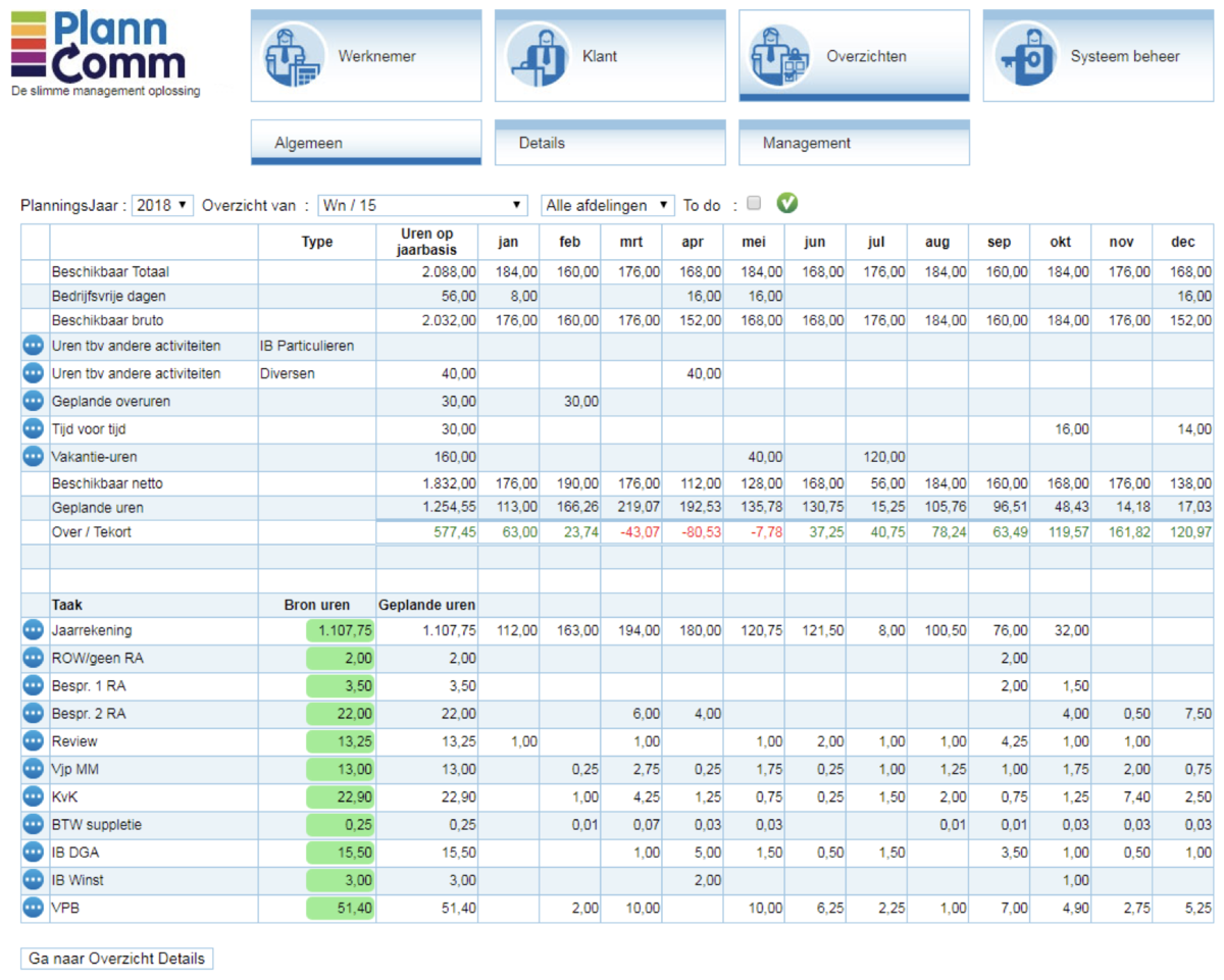 Bekijk uw jaarplanning in één oogopslag en zie in welke maanden er knelpunten zijn en ín welke maanden er nog ruimte is. U kunt op ieder moment controleren of u in de pas loopt met de werkzaamheden die in uw planning staan. Bekijk via de detailoverzichten wat er van u wordt verwacht. Hoeveel tijd u mag spenderen aan een werkzaamheid. Kortom: U weet precies wat er van u wordt verwacht en dat geeft rust.